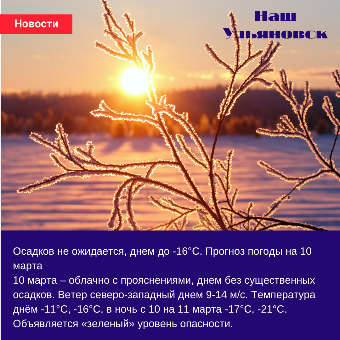 10 марта – облачно с прояснениями, днем без существенных осадков. Ветер северо-западный днем 9-14 м/с. Температура днём -11°С, -16°С, в ночь с 10 на 11 марта -17°С, -21°С.