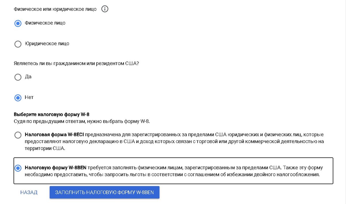 Как вы заметили есть еще одна форма W-8ECI (вам она не нужна), эту форму выбирают люди кто имеет свой бизнес или работодателя на территории США (YouTube не ваш работодатель).