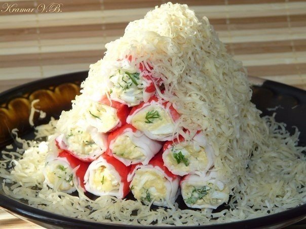 Яйца сварить, охладить, почистить и натереть на крупной тёрке. Сыр натереть на мелкой тёрке. Чеснок пропустить через пресс. Зелень намыть, обсушить и мелко порезать. Соединить яйца, сыр, зелень и чеснок. Добавить майонез и хорошо перемешать. Завернуть нашу начинку в крабовые палочки, выложить горкой и посыпать тёртым сыром.