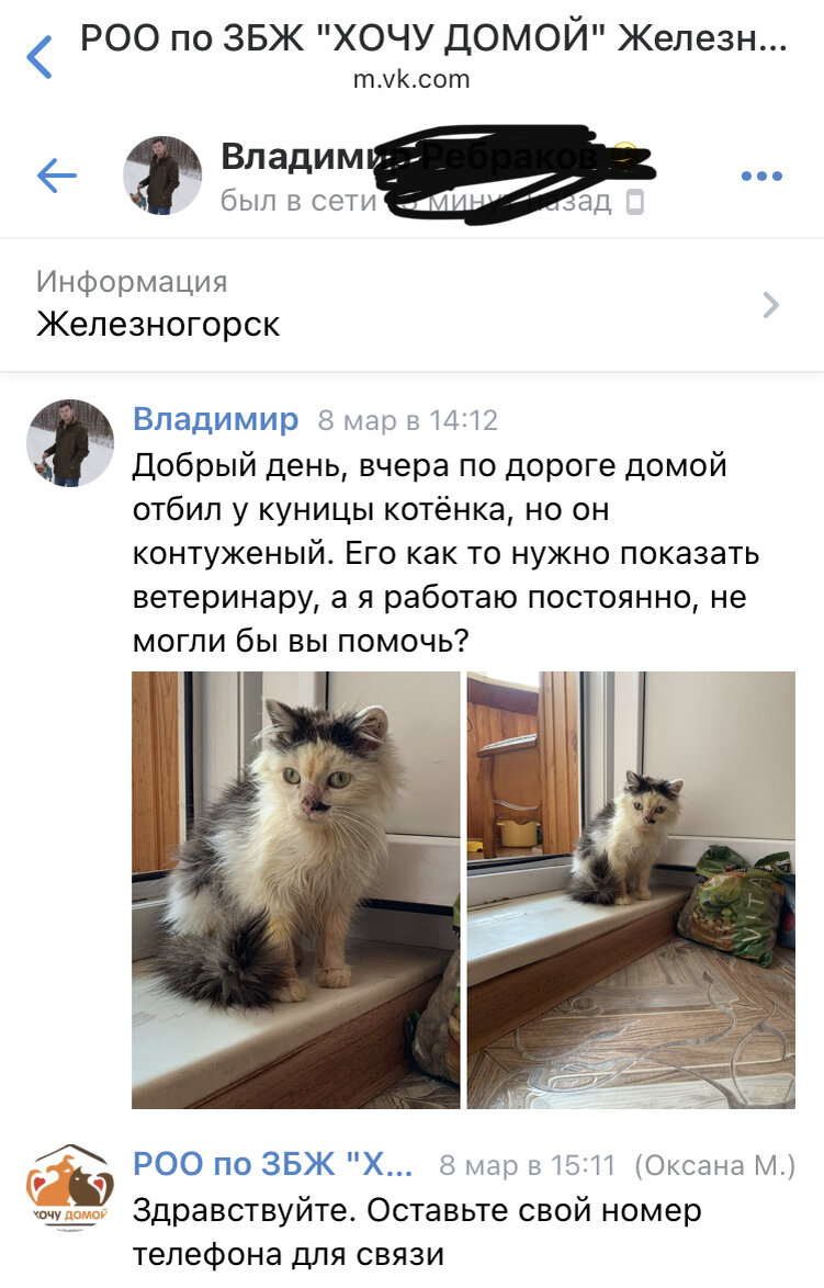 Такого ещё не было в нашей практике. Молодой человек ехал по своим делам на машине и вдруг увидел, что куница тащит что-то по дороге. Парень остановился и увидел, что у нее небольшой котенок. Малыш громко кричал. Парень начал пугать куницу, бросать снежные камни и та, испугавшись, отпустила котенка и убежала. Котенка молодой человек забрал, но что делать с ним не знал. Было видно, что малыш поврежден и серьезно. Тогда он обратился за помощью в нашу группу