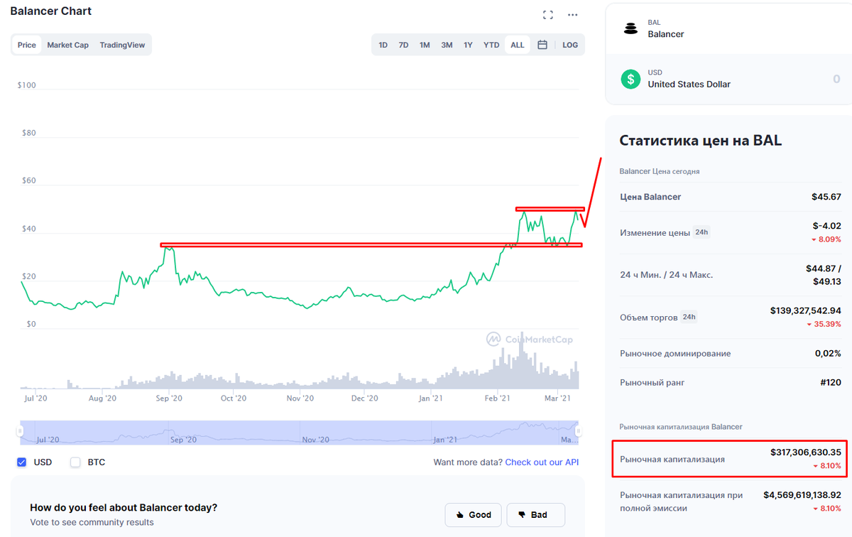 Покупал эту монетку еще по 30$. Она находится в разделе DeFi. Относительно маленькая капитализация. Посмотрите на графики криптовалют UMA, UNI, Aave и вы увидите какой большой потенциал есть у BAL. DeFi показывают очень крутые результаты, Balancer не должен быть исключением. Есть хороший уровень поддержки на 30$, многие хотят покупать по этим ценам. Уровень сопротивления находится на отметке 50$. Скоро уровень будет пробит и увидим график в районе 70-100$. Оптимистично, согласен.