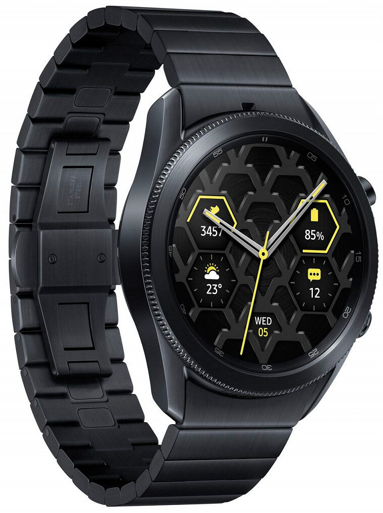 Обычная модель Galaxy Watch3, за которую просят не 50 000, а всего 35 000 рублей. Корпус здесь, правда, не титановый, а из нержавеющей стали. Но от этого часы в прочности и надёжности теряют не так уж много. Тем более, что закалённое стекло на циферблате и защита от пыли и влаги по армейскому стандарту IP68 тоже никуда не делись. К тому же в комплекте идёт стильный кожаный ремешок, который отлично подойдёт даже под дорогой костюм.