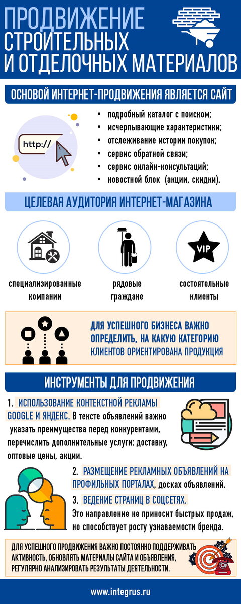 Комплексное продвижение магазина строительных и отделочных материалов нуждается в грамотном ведении рекламы в Интернете. Основой интернет-продвижения является сайт магазина, включающий в себя следующий функционал: