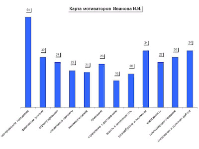 в) отношение человека к объекту потребности г) ситуацию, в которой чаще всего возникает эта потребность д) процесс реализации потребности е) эмоциональные переживания человека (личные, в отношениях "субъект-объект" потребности, в процессе реализации потребности). Немного об эмоциональных переживаниях, которые порождает удовлетворение или неудовлетворение потребностей. В регуляции поведения человека эмоциональные процессы играют огромную роль. С одной стороны, создают состояние напряжённости, которое толкает человека к действиям, обеспечивающим удовлетворение потребностей. С другой же, рождающиеся в самом процессе удовлетворения потребности, являются подкреплением самого процесса. Таким образом, именно благодаря связи эмоционального переживания с потребностями человека, эмоциональная сфера выступает в качестве побуждения к деятельности, которая может удовлетворить потребность. А соединённая с системой эмоциональных переживаний, образует мотив - непосредственный побудитель деятельности. Именно мотив - основную побудительную силу в психической деятельности - целесообразно рассматривать как познавательно-эмоциональную систему, выполняющую функцию регулятора поведения. При этом с практической точки зрения важно помнить, что направленность эмоций, конкретный характер их побудительной мотивирующей силы полностью зависит от особенностей воспитания и развития человека. Поэтому высшие регуляторные механизмы, сформированные в ходе индивидуального развития, предоставляют возможность управлять стихийной силой эмоций в любой ситуации, в том числе и удовлетворения или неудовлетворения потребности. Какими же способами можно определить основные мотивационные факторы сотрудника? Во-первых, это фиксация информации об обучении, деятельности на предыдущих местах работы (особенно достижениях и причинах увольнения), причинах поиска новой работы и ожиданиях от нового места работы, полученная как в ходе телефонных бесед, так и в процессе интервью. Во-вторых, получение дополнительной информации с мест предыдущей работы от бывших руководителей, коллег и др. В-третьих, целенаправленное использование проективных вопросов (например: "Что побуждает людей эффективно работать?", "Что такое хорошая работа?" и др.) в ходе собеседования. В-четвёртых, использование в процессе профессионально-психологического отбора специальных диагностических методик. На мой взгляд, самым практичным из них является тест, который позволяет получить довольно подробную карту мотиваторов: