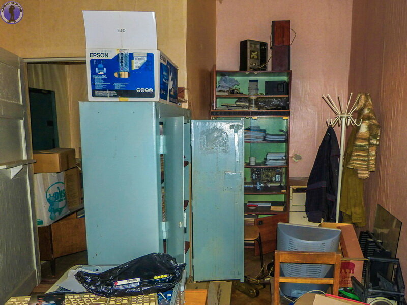 Сохранилась старая оргтехника, радиаторы отопления, советская мебель и различные предметы.