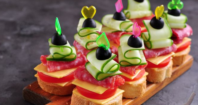 Для приготовления канапе подготовьте продукты по списку. Огурец и помидоры помойте, обсушите бумажным полотенцем.