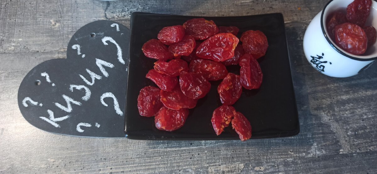 Сушеные помидоры черри. Узнать их очень просто, по ядрышкам, которые ни с чем не спутать, а кизил должен иметь внутри одну крупную продолговатую косточку, ну или не иметь ничего, если их в процессе сушки убирают, как из кураги. Но точно не семечки, как у помидоры черри.