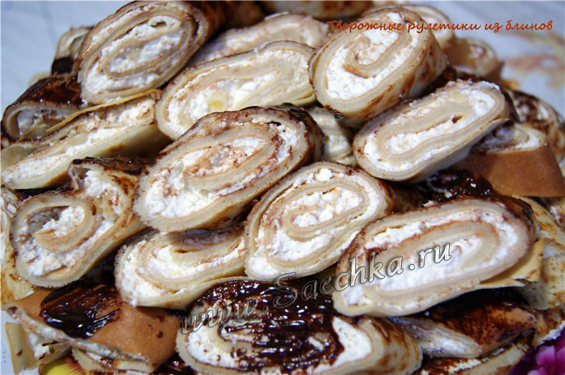 Рулетики из блинов приготовлены со сладкой начинкой из творога и банана.