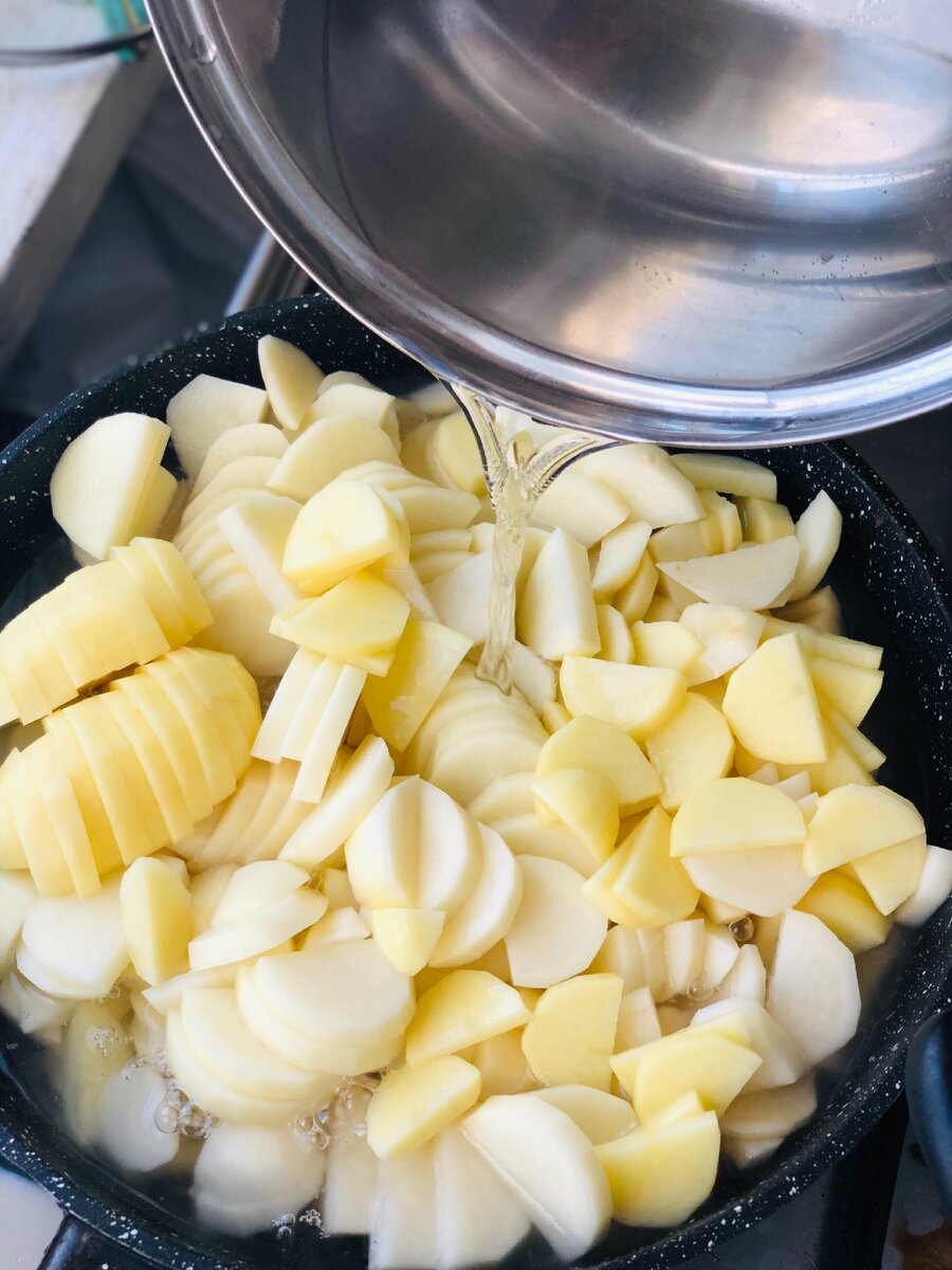 Очищенный картофель нарезаем как вам привычней, выкладываем на сковороду и заливаем водой, так она будет отвариваться минут 15, после закипания!