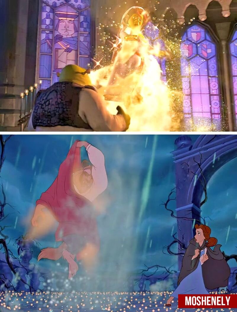 Дисней задолго до "Шрека" создавал прекрасные мультфильмы, в которых показывал, как чудовища превращаются в красавиц и где царит мир и любовь. Шрек же своим существованием бросил вызов всем этим застывшим на месте мультфильмам, показав, что порой и красавица превращается в чудовище (Фиона превратилась в огра в конце первого мультфильма).