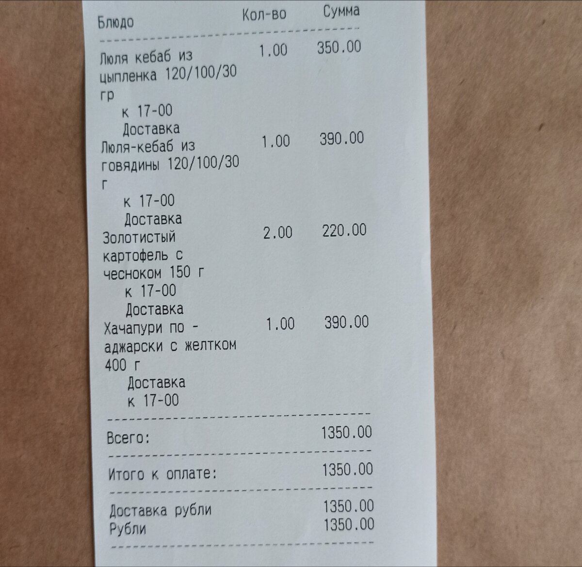 Заказ был сделан в грузинском ресторане на сумму 1350 рублей, что для моей семьи в принципе считается очень дорого, и я бы сама, не за что на свете (в моем нынешнем финансовом положении), его не сделала. Заказ был рассчитан на 2 человека и в него вошло: хачапури по аджарски за 390 рублей, люля кебаб из говядины за 390 рублей, люля кебаб из курицы 350 рублей и две порции картофеля золотистого по 110 рублей каждая.
