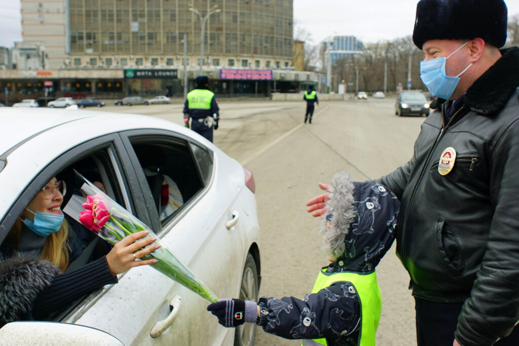 Цветочный патруль из инспекторов ГИБДД и детсадовцев поздравил ростовчанок с 8 Марта. Подарки от госавтоинспекции сумели получить не исключительно опытные, но также начинающие автомобилистки.