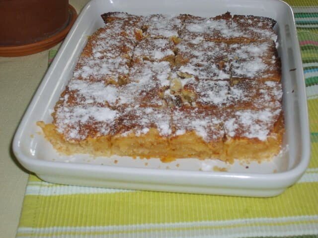 Выньте готовый пирог из духовки, полностью охладите его и лишь затем нарежьте на маленькие пирожные (2см на 2 см) чистым ножом, который следует протирать после каждого разреза. Посыпьте сахарной пудрой.