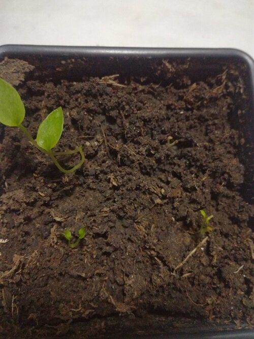 Все всходы были с семенными шапочками. Простимулировала, они правда подвытянулись, но с поставленной задачей справились. Мирабилис (он в центре), вообще корявый, долго тужился, но смог, как тот паровозик из сказки майора Пейна. Уже выбросил настоящие листики. С вытянувшейся рассадой бороться проще, особенно когда на дворе уже март.