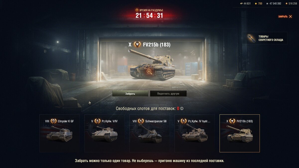 Я открыл контейнер и первым слотом сразу же выпал крайслер, его можно обменять на голду, но я решил посмотреть смогу ли я получить что нибудь другое, поэтому сделал еще 4 поставки за 5100000 кредитов. В итоге ничего интересного не выпало, а в пятый слот попалась Фв 215 183, которая мне не нужна, так как у меня есть Фв 4005, который по сути аналогичный и имеет такое же орудие.