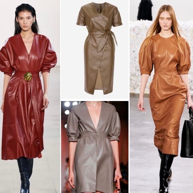 Именно кожаные платья становятся трендом весны 2021 года. Такие платья являются универсальными, их можно носить на работу, деловую встречу или даже на вечеринки. Всё зависит от фасона,в 2021 году он может быть любой, даже кожаные платья рубашки или платья с запахом можно надевать на более холодную весну как верхнюю одежду.Цвет тоже, может быть любым, но лучше всего остановить свой выбор на платье с коричневой, чёрной или бежевой кожей, но если вы не боитесь экспериментов, то можете выбрать более яркие цвета: