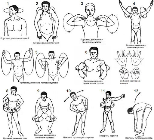Выполняйте всевозможные наклоны головы вперёд и назад, вращения в плечах, в локтях, в кистях и т.д.