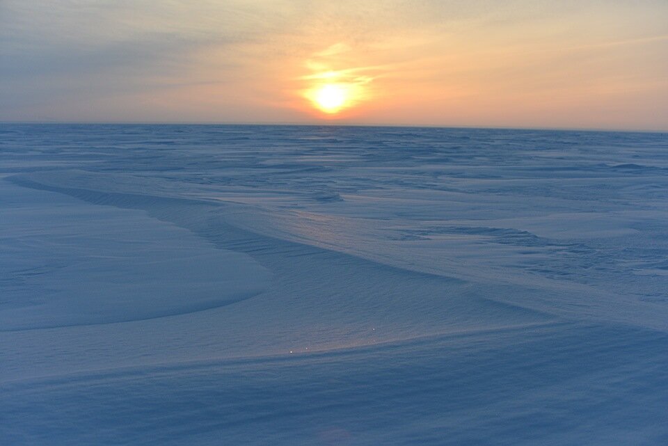 Отойдя от берега с километр, стало смешно. Весь свободный снег со льда сдуло к берегу. Поэтому у берега заносы и перемёты выше колена, а на акватории — голимый наст.