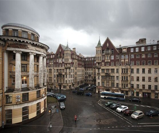 Громадный д ом, украшенный башнями со шпилем, пилястрами и полуколоннами занимает большую часть квартала на углу Старорусской и Новгородской улиц. Это поражающее своей красотой здание было построено для хлеботорговца и купца 1-й гильдии Полежаева. В свое время этот дом даже стал декорациями для съемок фильма «Мастер и Маргарита».