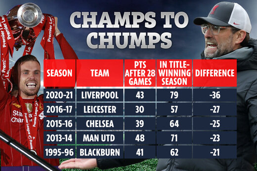 "Красные", проиграв матч Фулхэму установили антирекорд, несмотря на прошлый, победный для Ливерпуля чемпионат, где они устанавливали победные рекорды, в этом году они показывают очень слабую форму, на данный момент Ливерпуль - худший чемпиона Англии за всю историю. Такого старта сезона не было ни от одного другого клуба, бравшего трофей. Даже сенсационный Лестер показывал лучший ход в сезоне.