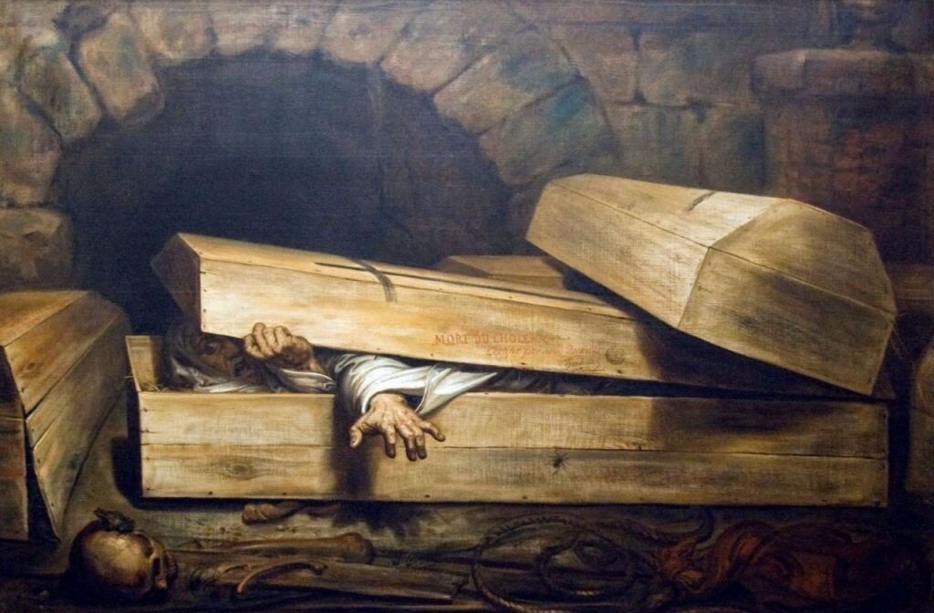 Другая история, но уже не такая жуткая, произошла в Англии в 1838 году. Один чиновник всегда боялся быть похороненным заживо и, как назло, его страх материализовался. Уважаемый человек проснулся в гробу и начал кричать. В тот момент по кладбищу проходил юноша, который, услышав голос мужчины, побежал за помощью. Когда гроб был вырыт и открыт, люди увидели покойника с застывшей жуткой гримасой. Потерпевший скончался за несколько минут до спасения. Врачи диагностировали у него остановку сердца, человек не смог выдержать такого ужасного пробуждения к действительности.