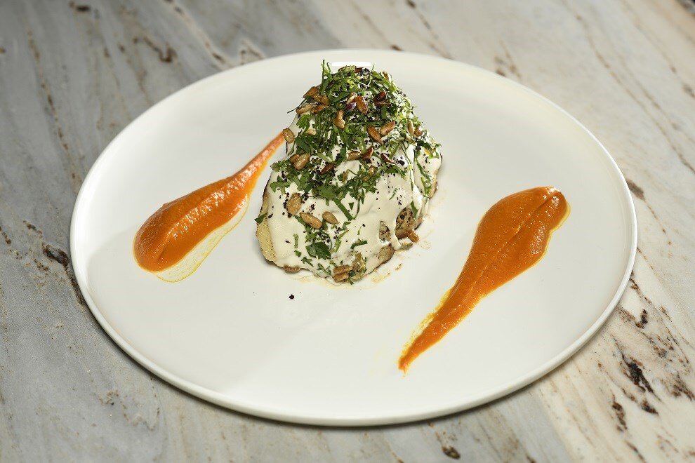 4. Обжаренную капусту полить йогуртом из кешью, посыпать рубленой зеленью, каперсами, мелконарезанным красным луком, семечками подсолнуха в карамели и пудрой из обжаренных семян конопли.