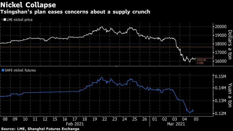 На днях китайский металлургический гигант компания Tsingshan Holding Group Co сообщил о планах начать массовые поставки никеля местным производителям аккумуляторов. Это известие за два дня обвалило мировые цены на никель на 20 %. До этого цены на никель стабильно росли около года на фоне опасения дефицита этого металла, ключевого для производства литиевых аккумуляторов.