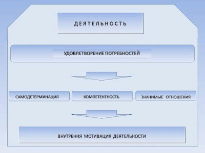 При этом важно помнить, что если преобладающей ценностью человека является самодетерминированность, то важно, чтобы ему никто не приказывал. Если преобладает компетентность - важнее всего ощущать, что его ценят за знания и умения, что он достиг в чём-то успеха. А если это значимые отношения, то самым главным является работа в коллективе, где все между собой находятся в дружеских отношениях, где он всем нужен и интересен. А ещё бывает и так, что у кого-то нет ни одной из выделенных ценностей - тогда у человека отсутствует внутренняя мотивация, и он большую часть времени ощущает себя пешкой, и, возможно, ему это нравится. Соответственно, в упрощённой форме процесс формирования внутренней мотивации в деятельности (что заставляет сотрудника работать изнутри), можно представить в следующем виде: