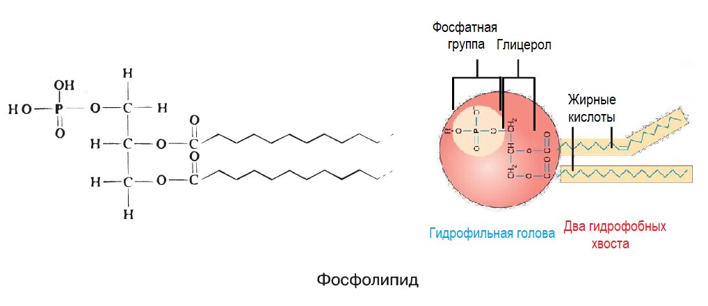 Мембраны почти целиком состоят из белков и липидов (или жиров). Липиды в подавляющем большинстве представлены фосфолипидами. Фосфолипид состоит из 1 молекулы фосфорной кислоты, 2 молекул жирных кислот и молекулы глицерола, которая объединяет этот ансамбль в единое целое.