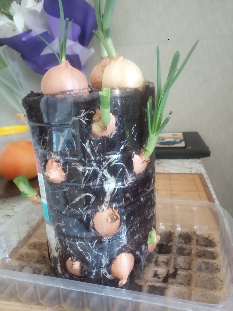После того, как бутылка с отверстиями будет готовы, нужно насыпать первый слой земли и утрамбовать его. Выкладываем первый ряд луковиц, чтобы носик выходил в отверстие. Выкладываем второй слой земли и повторяем размещение луковиц в таком же порядке. После того, как бутылка будет заполнена, сверху можно воткнуть несколько луковиц или оставить всё как есть и просто полить “грядку” прохладной водой. Лук очень любит воду. Через 3 дня появятся первые отростки.