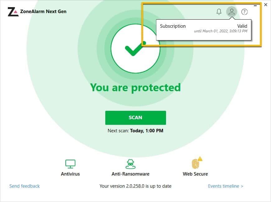 3. Проверить срок действия лицензии и количество защищенных устройств можно нажатием на иконку профиля в правом верхнем углу.