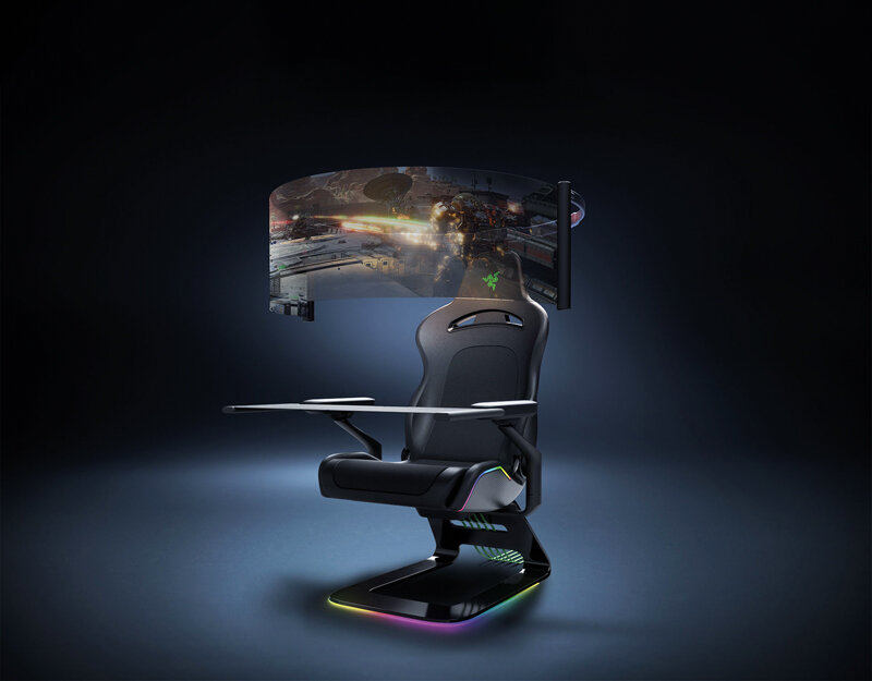 Это необычное игровое кресло из углеродного волокна предлагает подсветку RGB и может превращаться в целую игровую стойку с панорамным экраном, встроенным в кресло, активной обратной связью и подлокотниками 4D, которые можно превратить в регулируемые модульные столы.