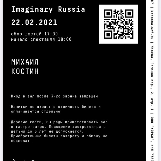 Название спектакля – «Imaginary Russia», а его идея заключается в том, чтобы показать развитие нашей страны через века. Задумка отличная, только язык для наименования выбран не русский, а английский, что тут же намекает на «заточенность» проекта под иностранного посетителя. Кстати, название самого проекта Krasota тоже на латинице. Начало сеанса в 18:00. Прибытие (по просьбе ресторана) в 17:30.