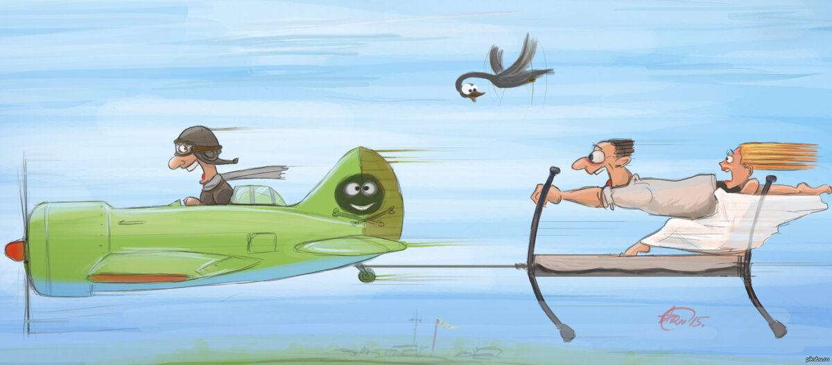 На одном аэродроме совершенно случайно оказались американский Б-52 и наш родной Ан-2. Вечером их экипажи встречаются в кабаке и, естественно, американцы начинают над нашими подшучивать, дескать допотопный у вас аэроплан, тихоходный и т.д. Разумеется наш командир не выдержал и поспорил на ящик водки, что завтра утром он американцев перегонит. Утром просыпается экипаж в гостинице, все смутно вспоминают вчерашний спор.
