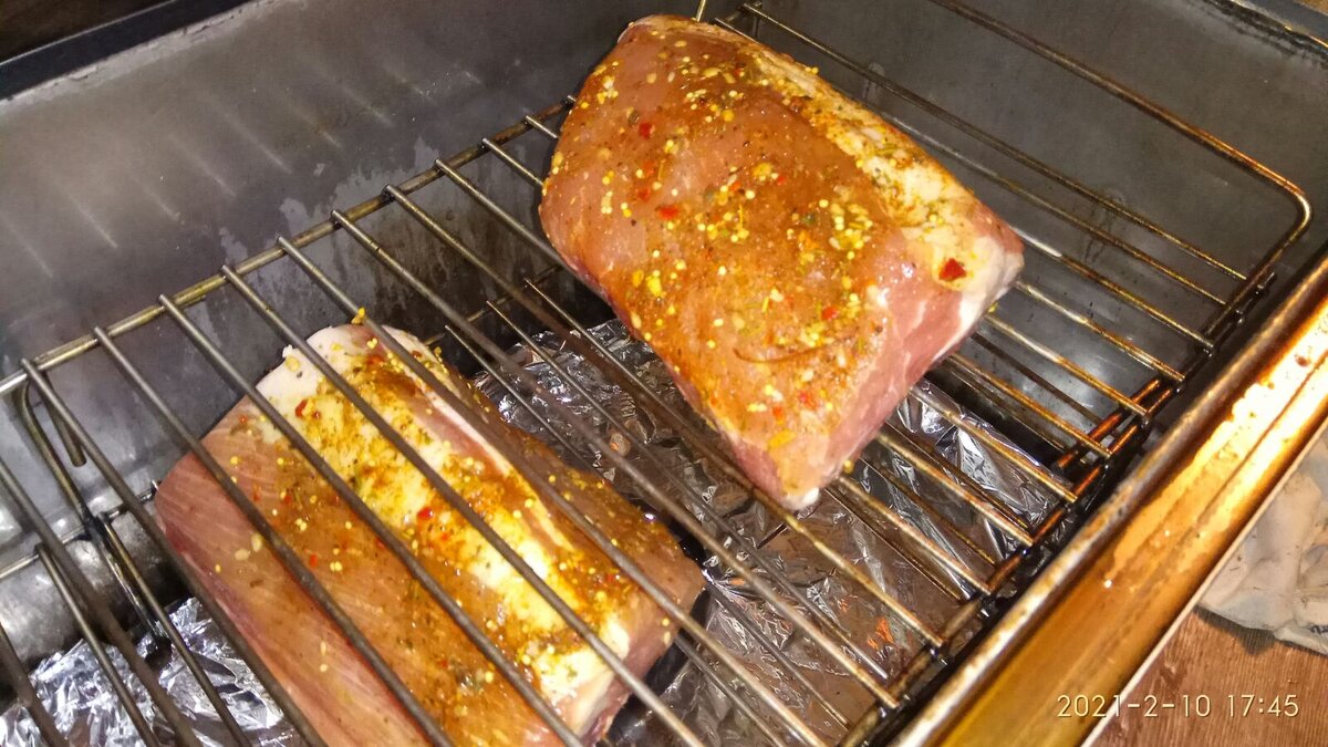 Не всегда получается продать сразу много свежего мяса,поэтому коптим его. Это не только помогает дольше сохранить его,но и делает в разы дороже. Прежде всего мясо надо засолить.Так как коптилка у нас не большая,мясо режем на не крупные куски. В связи с этим,посол можно провести сухим способом. Для этого на кг.мяса берём по 10 гр поваренной и нитритной соли(всего 20гр.). Если не планируется хранить долго,можно использовать только поваренную. Специи берём любые,которые нравятся. У меня приправа для свинины плюс горчица в зёрнах. Некоторые утверждают,что при копчении специи не нужны. Не знаю,мне нравится со специями. Специи смешиваем с солью и натираем этой смесью мясо. После этого заварачиваем в пищевую пленку и убираем не меньше чем на сутки в холодильник, лучше подольше. После того как мясо хорошо просолилось, можно коптить. На дно насыпаем щепу,на нее устанавливаем поддон. Для того чтобы его легче было мыть оборачиваем фольгой. Далее раскладываем на решетку мясо,которое предваритель