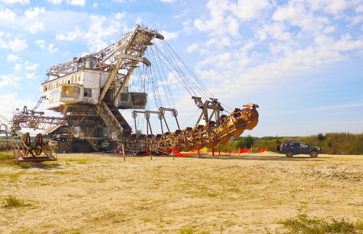 1. Абзетцер или многоковшовый экскаватор на гусеничном ходу T akraf ERS 710 производства ГДР высотой с пятиэтажный дом. Цифра 710 в названии означает объем ковша, которых на этом монстре 36 штук. При работе экскаватора, один железнодорожный вагон заполняется песком полностью за 1 минуту. Основная кабина напоминает жилую комнату, с кроватью, холодильником, шкафом. Питание экскаватора осуществляется полностью от электричества. С отдельной подстанции по кабелю толщиной с руку приходит 6кв. Масса абзетцера около 2000тонн, передвигается при помощи 6 гусениц, при чем для поворота поворачивается только левая гусеничная тележка. Нам повезло побывать внутри на экскурсии. Масштабы впечатляют. Поднявшись на крышу открывается вид на уже зарастающий молодым лесом карьер, а в нескольких десятках метрах пролетел легкомоторный самолет. Немецкие инженеры собирали этот комплекс в карьере около 4х лет.