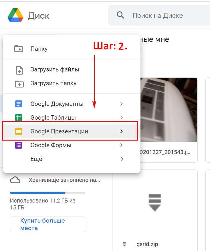 Шаг 2: нажмите «Создать», далее выберите в списке Google Презентации.