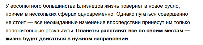 Близнецы в первый месяц находятся в зоне больших перемен. Эти перемены кардинально изменят судьбу Близнецов и помогут реализовать, давно желанные, проекты и улучшить их жизнь. Некоторые повороты судьбы будут непонятны первое время Близнецам, но со временем все встанет на свои места. Также перемены коснутся окружения Близнецов.
