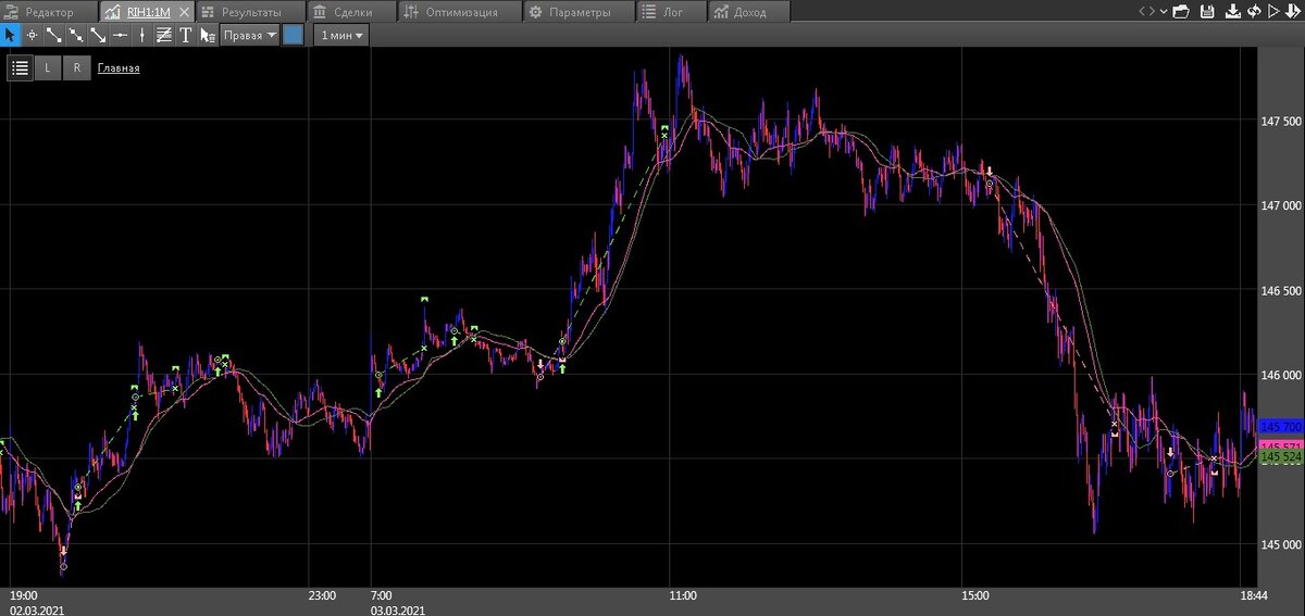 И на самом деле она в полтора раза меньше, чем доход от штатных скользях. Разница только в том, что стандартный индикатор совершит за это время более 700 сделок, а наш вариант в два раза меньше.