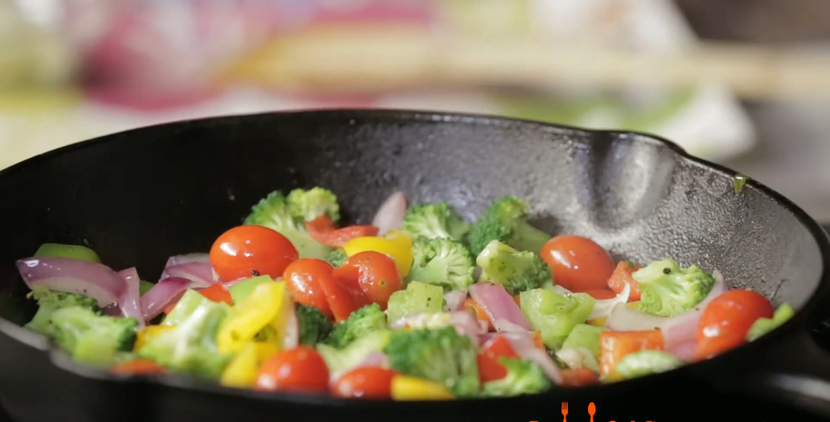 Нагрейте масло в большой сковороде с антипригарным покрытием, пригодной для духовки, на среднем огне. Добавьте лук, болгарский перец, 1/4 чайной ложки соли и щепотку черного перца. Готовьте, пока овощи не станут мягкими, около 4 минут. Добавляйте капусту порциями, подождите, пока каждая партия высохнет, прежде чем добавлять еще, и готовьте до готовности, еще около 6 минут. Уменьшите огонь до минимума, добавьте киноа и перемешайте.