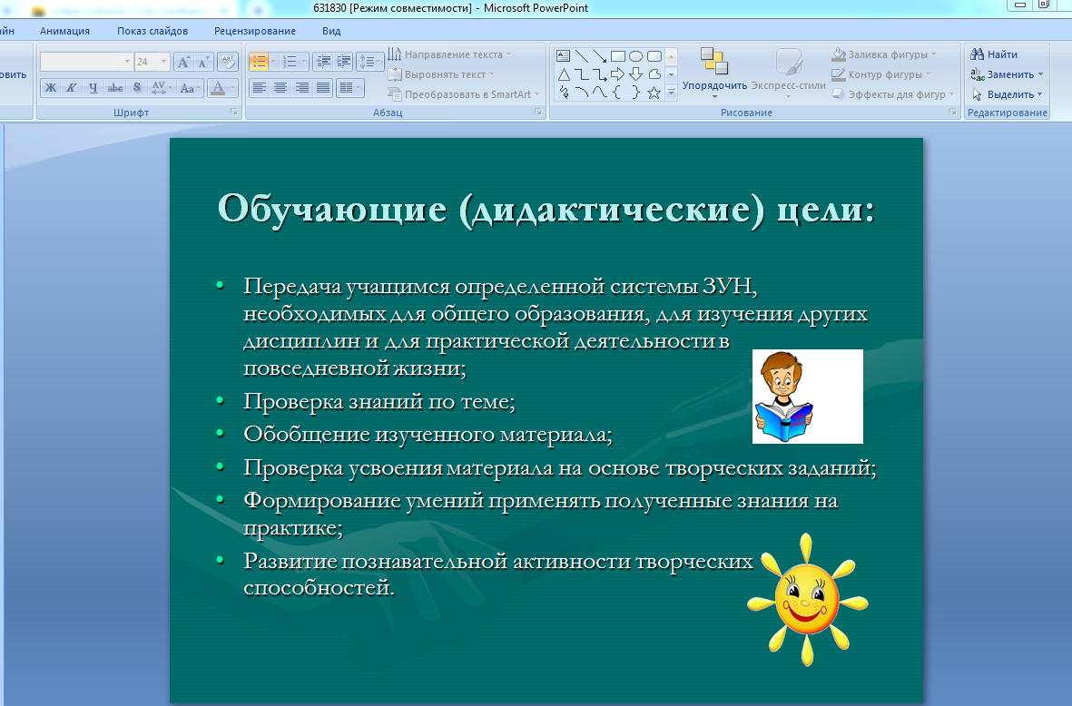 А детям плевать на перечисленные в виде списка цели. Им также плевать на перечисленные в виде другого списка задачи. И им тем более плевать на всякий другой текст, который не имеет отношения к рассказу урока.