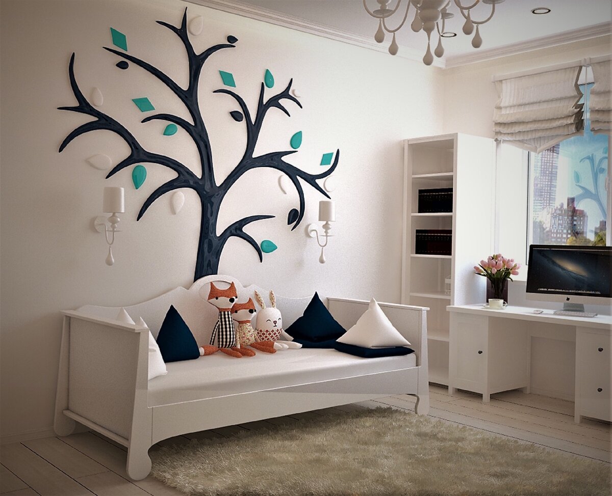 Особое внимание следует уделить освещению комнаты. В детской должно быть общее верхнее освещение (люстра) и обязательно индивидуальные осветительные приборы для занятий и подготовки уроков и чтения.