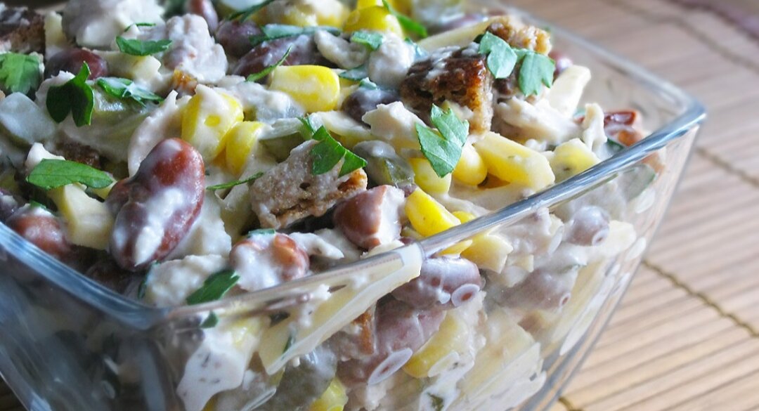 6. В салатнике смешать куриное филе, фасоль, сыр, кукурузу, маринованные огурцы, петрушку и чесночные сухарики из черного хлеба,добавить майонез .Салат еще раз перемешать.Готово))))))ПРИЯТНОГО АППЕТИТА!!!!!!