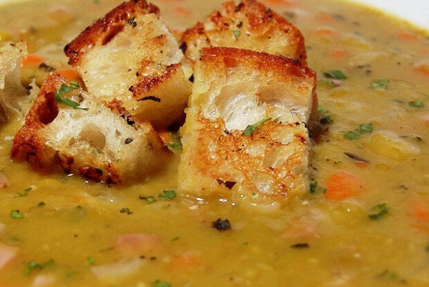 8. Волшебный ритуал соединения! Если вы варили кости, достаем из бульона кости, если вы варили ребра или другое мясо — аналогично экспроприируем его из бульона (любители мяса, могут нарезать его на небольшие куски и вернуть в бульон, но я предпочитаю гороховый суп, только с копченостями). Аккуратно выкладываем гороховую кашу из блендера в бульон, как правило она выпадает одним куском напоминающим обратную сторону питания, но ничего страшного, для решения этой проблемы я пользуюсь давилкой для пюре, пару ударов внутри кастрюли и ком распадается и вода становиться загадочно мутной (пару ударов, это пару ударов, там картофель, не сделайте из него кашу). Туда же добавляем остатки цельно варенного гороха и перемешиваем. Выкладываем со сковороды зажарку, перемешиваем. Все копчености, минуя рот, должны попасть в суп, и снова перемешиваем. Теперь секретный ингредиент — кетчуп, я добавляю простой томатный кетчуп (кетчуп, а не томатную пасту, удивительно на сколько много в кетчупе вкусовых усилителей, и как они влияют на вкус супа), главное — не переборщить, суп не должен стать красным, обычно хватает 2–3 столовых ложек, все зависит от объема кастрюли. Перемешиваем.