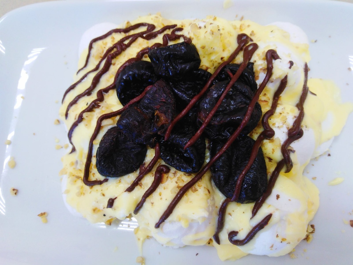Выложите первый слой безе с черносливом на своё усмотрение (можно как на фото, можно горкой). Затем, смажьте поверх безе кремом, и наложите на него второй слой, и также смажьте кремом. Все промежутки замажьте кремом. Сверху посыпьте грецким орехом, и украсьте растопленным горьким шоколадом. Поставьте в холодильник на 1 час, и после можно смело есть. Приятного аппетита!