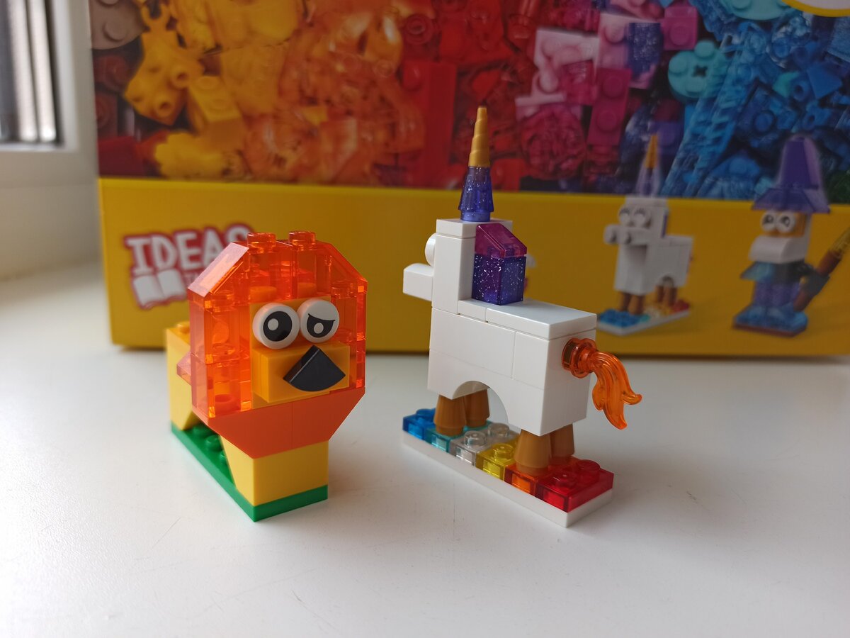 На этот раз у меня набор для свободного конструирования, для творчества с прозрачными кубиками. Идите, фантазируйте сами! В прилагающейся инструкции есть некоторые простые модельки, но они уж очень простые, для совсем маленького ребенка. Хотя единорожка на импровизированной радуге симпатичный выходит, с огнём в заднице, лев такой же. Вон, у него даже глаз дергается.