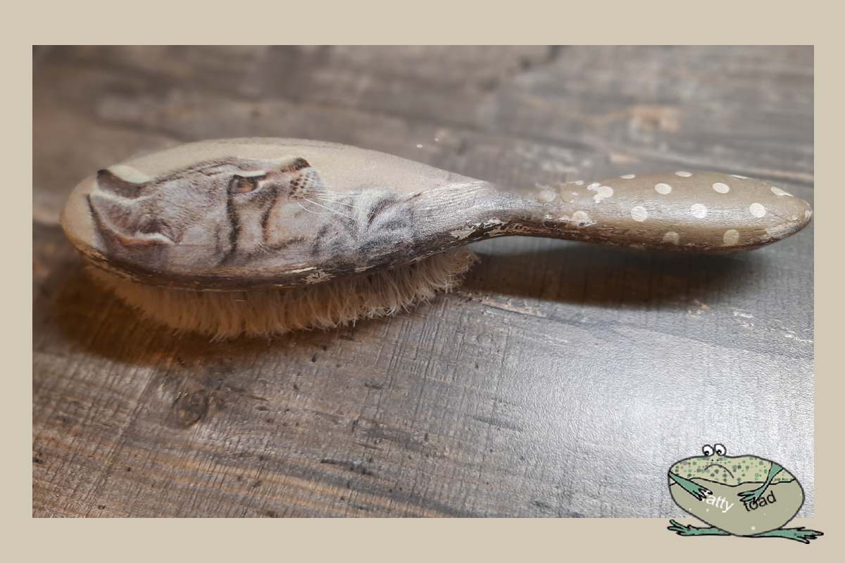 Начала я ее одаривать декупажным приданым с простого. Даже новой заготовки не купила. Просто взяла старую одежную, изрядно облезшую, но из натурального дерева щетку и подарила кошке, отделав салфеткой. Чтобы все домашние поняли, что теперь это ее собственность! Зачем? Чтобы собирать шерсть с построенного нами домика и многочисленных лежанок.