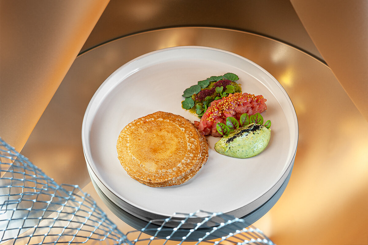 - Взбить все ингредиенты для гуакамоле в блендере. Для 1 порции отложить 50 г от получившейся массы, выложить рядом с тунцом, украсить пудрой из жареного репчатого лука.