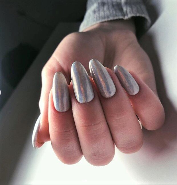 Металлическая или зеркальная втирка, так же известная, как хром, пользуется наибольшей популярностью у любительниц эффектных дизайнов. Она создает ровную зеркальную поверхность, имитирующую металлический блеск. Чаще всего встречается золотая и серебряная, но, при желании, можно сделать розовую или любую другую расцветку.