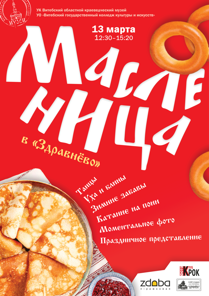 13 марта с 12.30 до 15.20 состоится Масленица в Музее-усадьбе И.Е. Репина» Здравнёво. Обещают танцы, дегустацию ухи и блинов, праздничное представление и танцы.